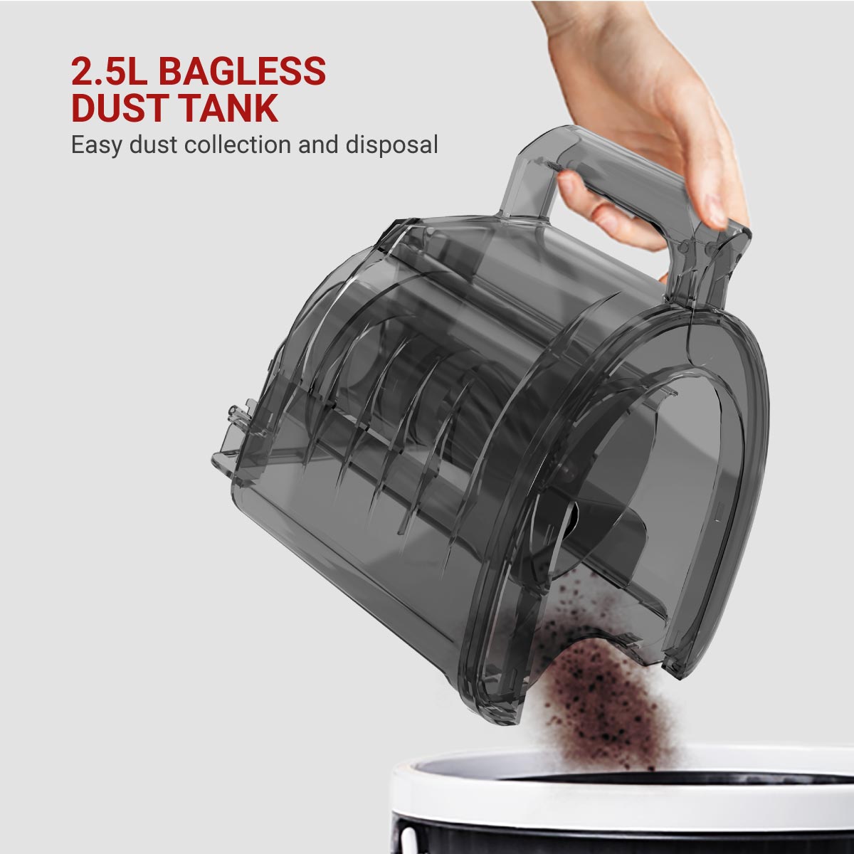 - Large 2.5 L Bagless Tank – The biggest in its category, allowing extended cleaning with fewer interruptions. Hygienic one-touch emptying ensures mess-free disposal.